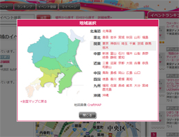 「ことさが」は、イベントの検索結果を一覧表示だけでなく、視覚的にイベントを探しやすい「地図表示」機能を用意しています。 |